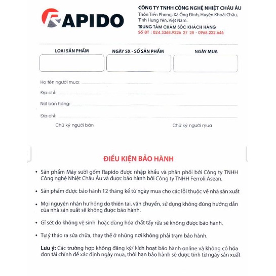 Nguyên lý hoạt độngMáy sưởi gốm Rapido (Ceramic) hoạt động dựa trên nguyên lý sử dụng điện năng đốt nóng thanh gốm và dùng nguyên lý đối lưu để tỏa nhiệt. Máy sưởi gốm Rapido dùng gốm làm vật phát nhiệt, bộ phận này trong máy sưởi gốm là một miếng gốm có hình dạng dẹt như một chiếc đĩa gọi là đĩa gốm. Đĩa này được nối với một vật bằng kim loại, khi đĩa gốm được làm nóng lên sẽ truyền nhiệt cho dây kim loại và dòng nhiệt lượng đó sẽ được truyền đi theo hình thức đối lưu và mang hơi ấm tỏa ra từ từ ra bên ngoài giúp tăng nhiệt độ phòng mà không gây sốc nhiệt. Công nghệ sưởi PTC Ceramic nên không xảy ra quá trình oxy hóa giúp kéo dài tuổi thọ của sản phẩm.