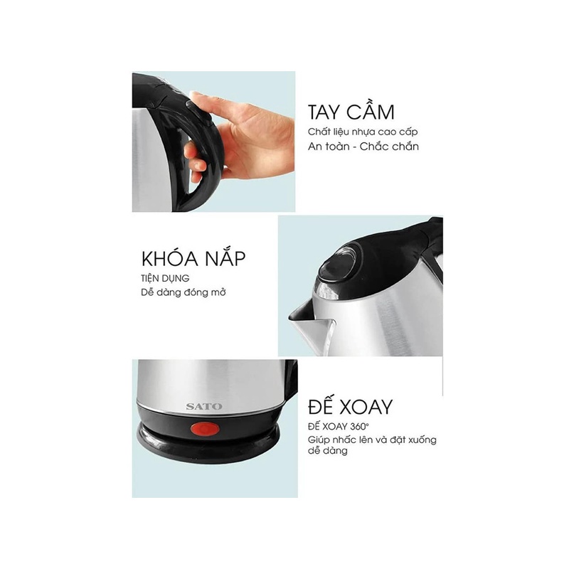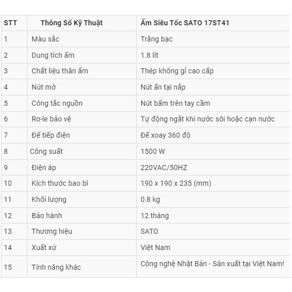 Thiết Bị Điện Gia Dụng > Đồ gia dụng nhà bếp > Ấm đun siêu tốc || Siêu tốc inox - Ấm siêu tốc SATO 17ST-45, Dung tích 1.8L, Bình đun nước sôi Nhật Bản mất 3 phút BH 12 tháng (KHOSKOSI)Còn hàng