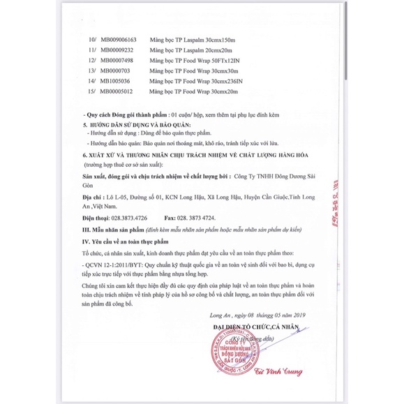 - Sản phẩm có chứng nhận của Cục An Toàn Thực Phẩm - Bộ Y Tế