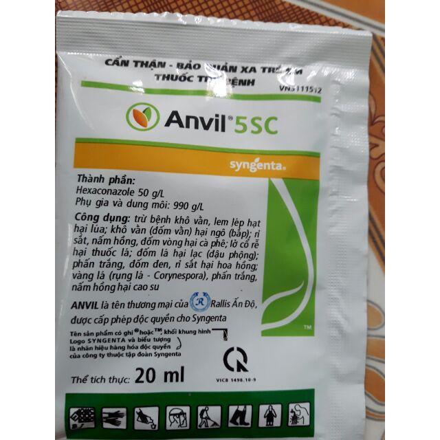 Vật tư nông nghiệp Thành Loan chuyên bán buôn bán lẻ tại Hà Nội vật tư, Anvil 5SC phòng trị hiệu quả các bệnh hại quan trọng trên lúa (khô vằn, lem lép hạt) và các loại cây trồng khác, giữ xanh bộ lá thông qua hiệu quả trừ bệnh tuyệt hảo. Đóng góp tích cực cho tối ưu năng suất và chất lượng hạt lúaAnvil là thuốc trừ bệnh phổ rộng, tiêu diệt nấm bệnh thông qua cơ chế ngăn cản sinh tổng hợp Ergosterol (chất cấu tạo nên màng tế bào nấm bệnh), nấm bệnh sẽ bị cô lập và ngừng phát triển do chúng không hình thành được tế bào mới. Anvil được mô cây hấp thu nhanh, chuyển vị và lưu dẫn mạnh nên kiểm soát nấm bệnh nhanh chóng, hiệu quả và kéo dài bằng cơ chế vừa phòng vừa trị bệnh.