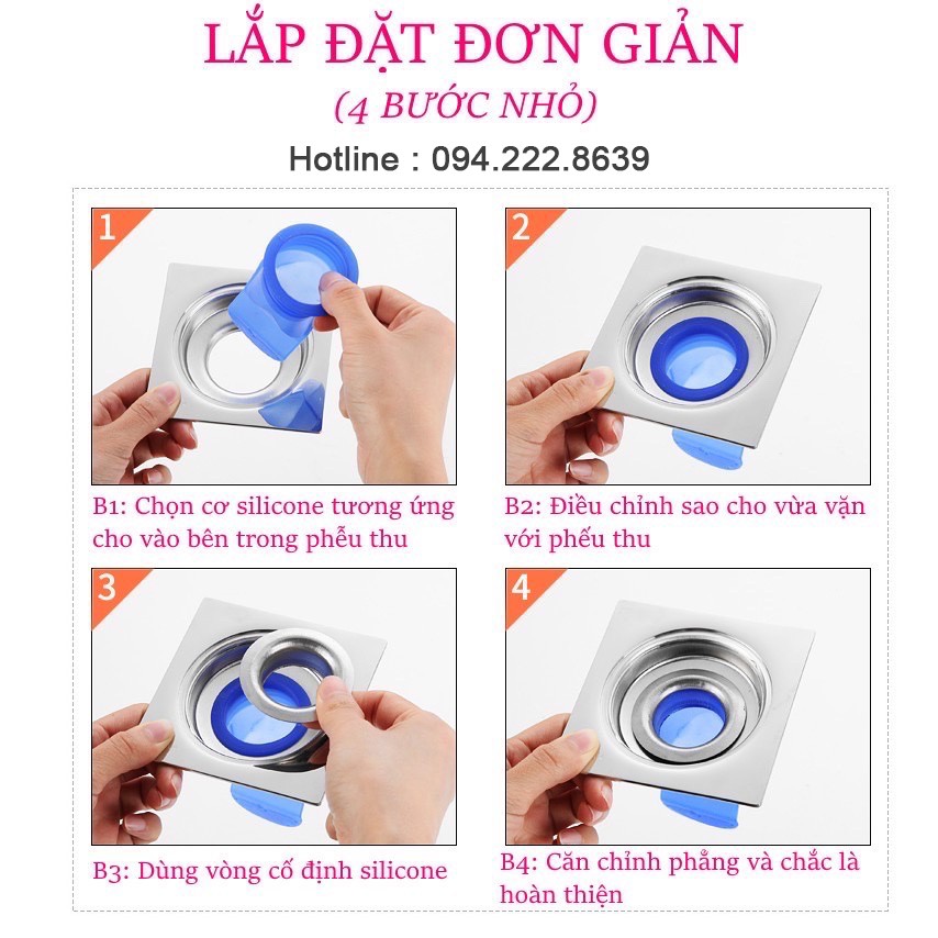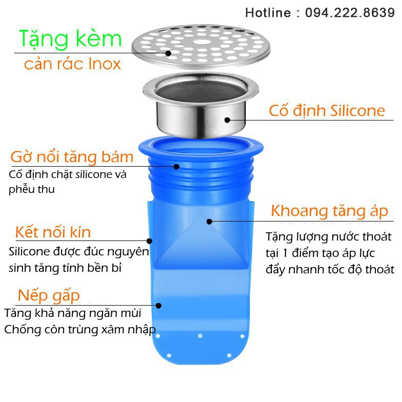 Với cấu tạo là trên to để thu nước, dưới thắt lại để ngăn mùi xông lên từ dưới, chất liệu Silicone siêu mềm, đàn hồi siêu bền cho phép nở ra khi có nước và khép chặt lại khi không có nước, do đó Silicone hoàn toàn ngăn mùi và vi khuẩn, côn trùng trào ngược lên.