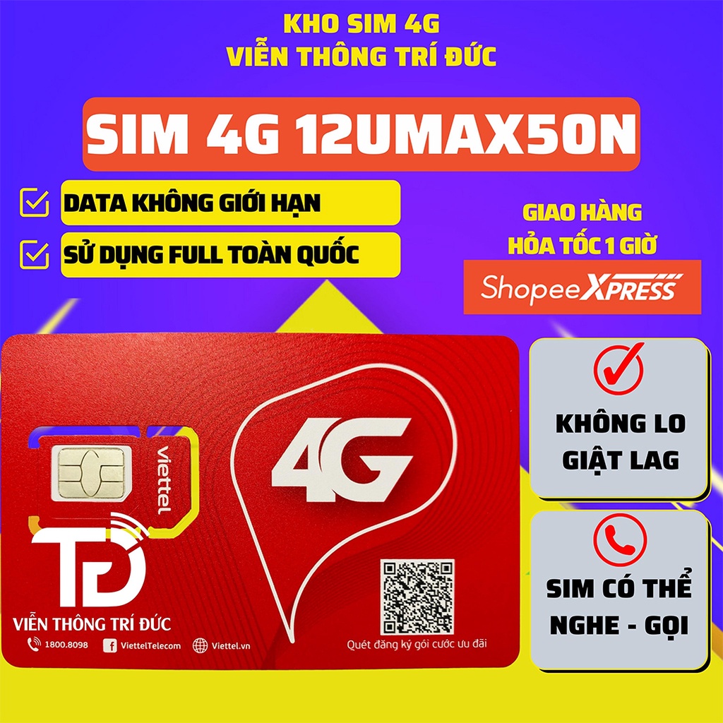 Sim 4G Viettel UMAX50N Data Không giới hạn, Max băng thông, Sim Phát Wifi, Thoải mái xem phim, chơi game, dùng toàn quốc👉 VIỄN THÔNG TRÍ ĐỨC LÀ NHÀ PHÂN PHỐI SIM CỦA CÁC NHÀ MẠNG VINAPHONE - VIETTEL - MOBIFONE - VIETNAMOBILE - ITEL GẦN 10 NĂM HOẠT ĐỘNG VỚI PHƯƠNG CHÂM UY TÍN LÀM NÊN THƯƠNG HIỆU