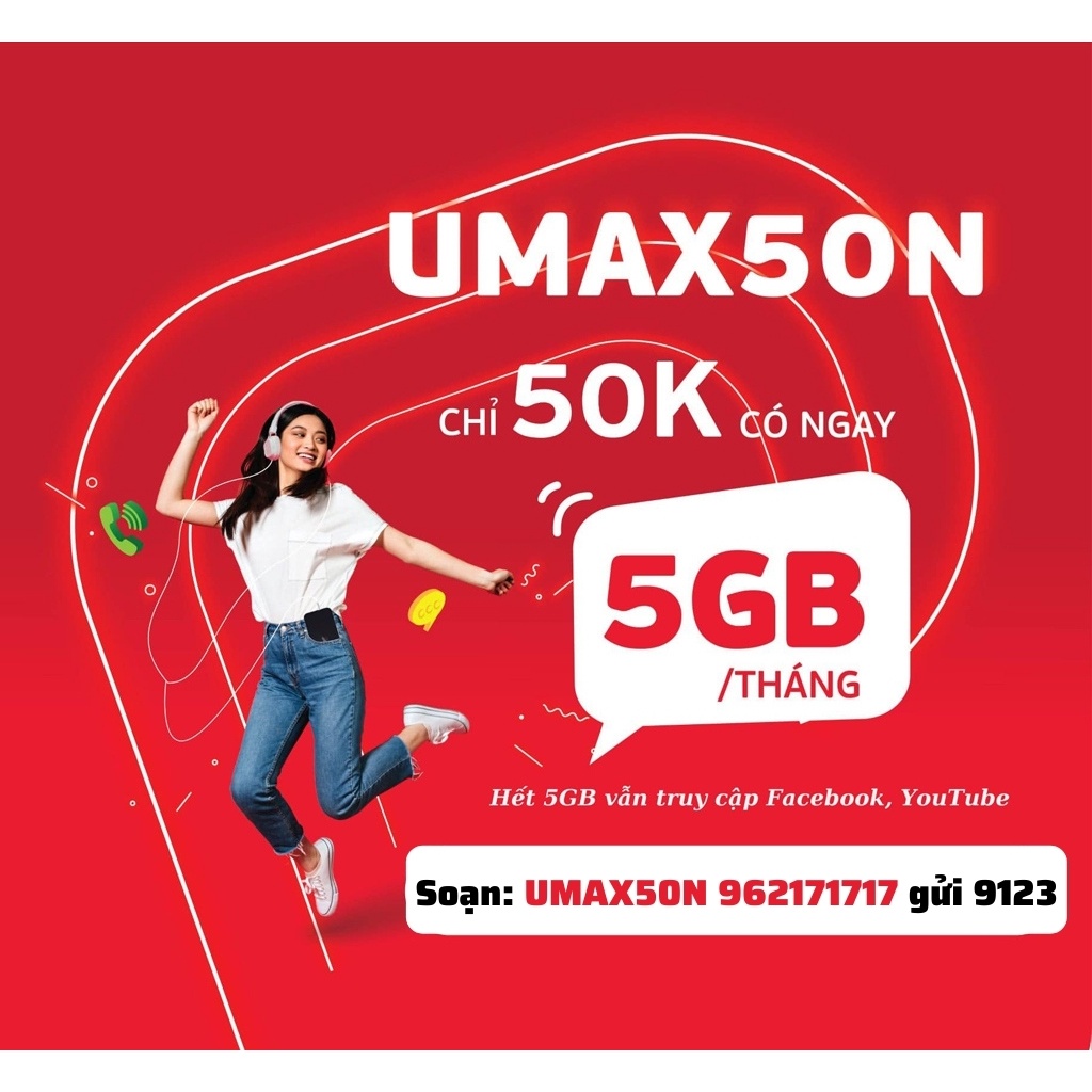 - Umax50n là gói cước ưu đãi Data có 5GB truy cập Internet tốc độ cao mỗi tháng. Hết tốc độ cao vẫn truy cập mạng tốc độ 3Mb không giới hạn lưu lượng. (Xem phim HD, Xem Youtube, Facebook, tiktok cực tốt...)