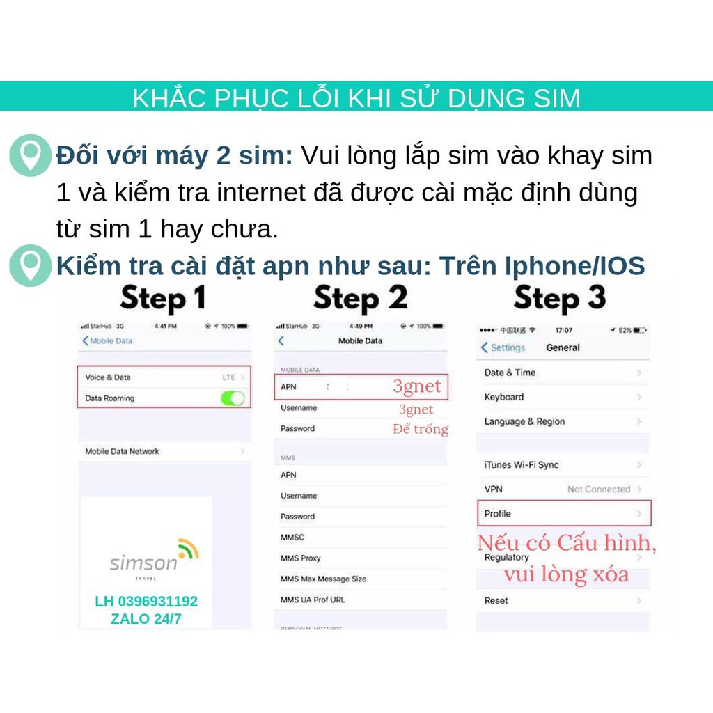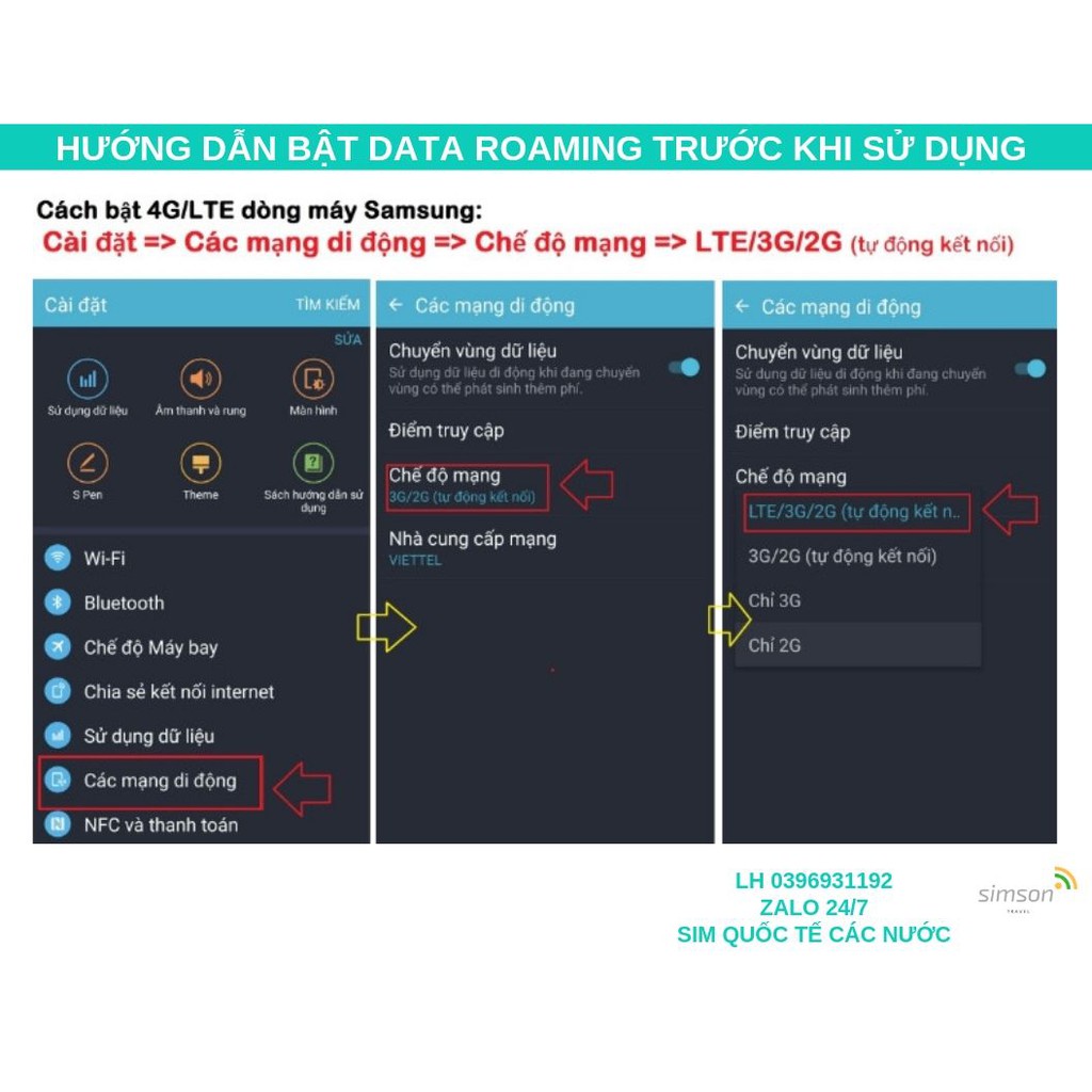 - Vui lòng bật Data Roaming (Chuyển vùng dữ liệu) để sử dụng sim (xem hướng dẫn theo ảnh sản phẩm)