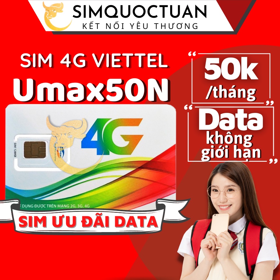 Sim Viettel 4G Umax50n Sim Data Không giới hạn dung lượng - Max băng thông, dùng toàn quốc có thể nghe gọi