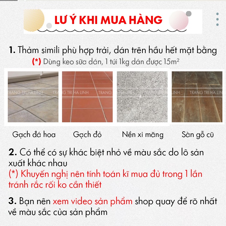 Trong quá trình chụp sản phẩm có một vài mã thảm simili không lên được chính xác màu thực tế (lệch khoảng 1-5%), mặc dù shop đã cố gắng chụp chân thực nhất để bạn cảm nhận rõ sản phẩm trên ảnh sẽ y như sản phẩm nhận được.