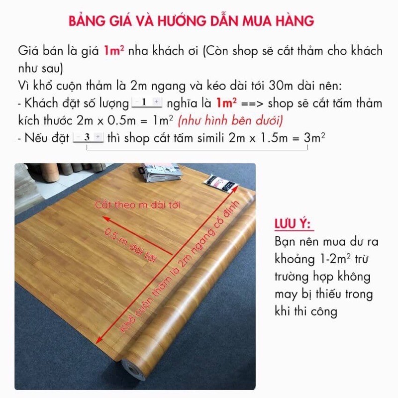- Khách đặt số lượng 1 lần nghĩa là 1m2, thì shop sẽ cắt tấm simili 2m x 0.5 = 1m2