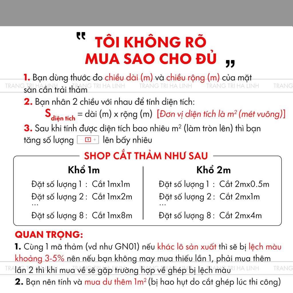 - Bạn đặt số lượng 1 là 1m vuông, shop cắt: 1mx1m