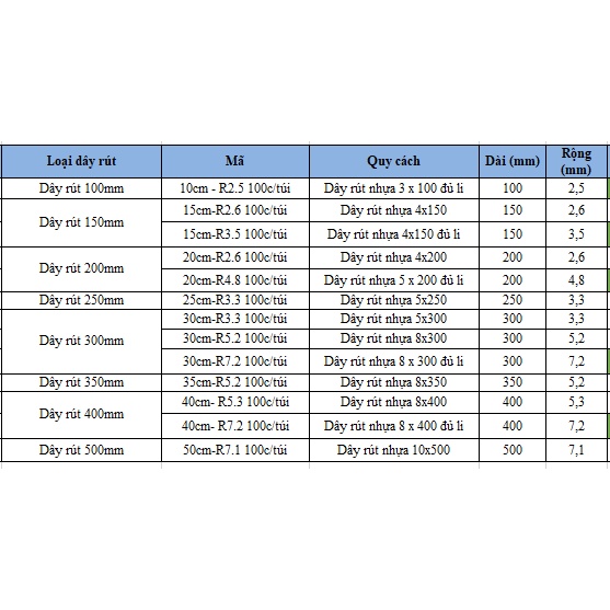 Loại dây rút Mã Quy cách Dài (mm) Rộng (mm)