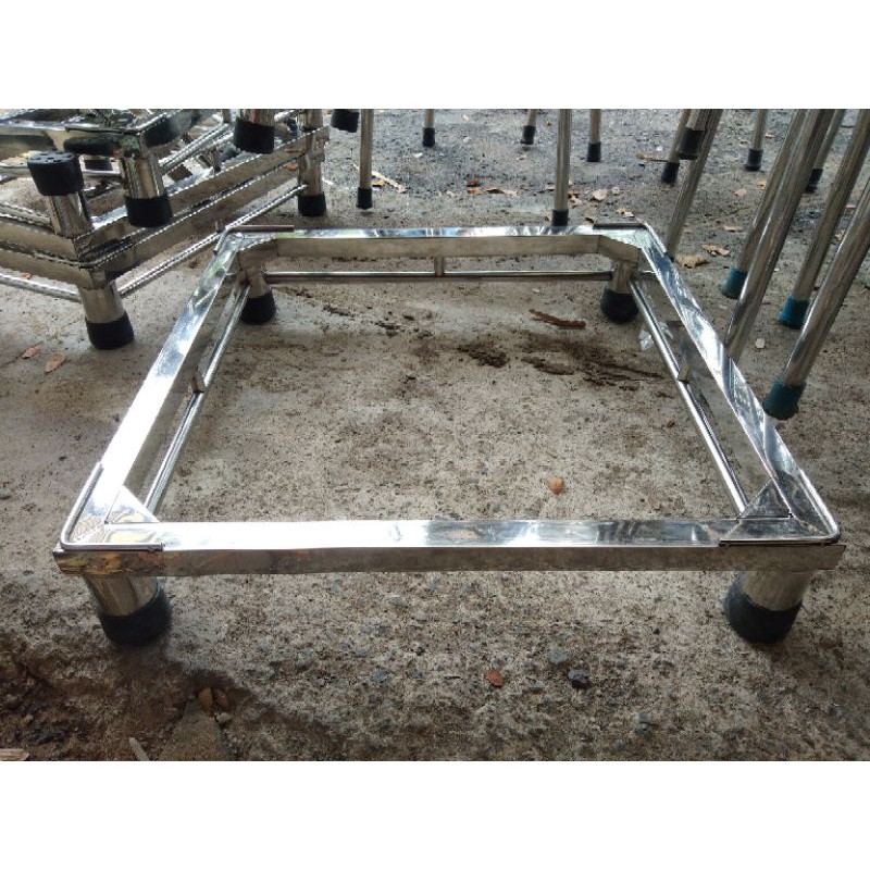 chân tủ lạnh, chân mấy giặc được làm từ 100% khung inox không si mạ.khung được làm từ hộp vuông inox 30x30(mm), chân tròn phi lớn 50(mm), 4 góc có 4 thanh inox bẻ cạnh vuông chống chân máy giặc, tủ lạnh trượt ra ngoài. phía trong 4 góc khung được hàn 1 hộp 30x30 cắt séo chịu lực rất cao( cao hơn hàng thị trường 4 miếng tôn rất nhiều). tất cả ống khung hộp để làm chân tủ lạnh, chân máy giặc đều được làm từ inox loại Dày, inox bóng sáng chống gỉ sắt.