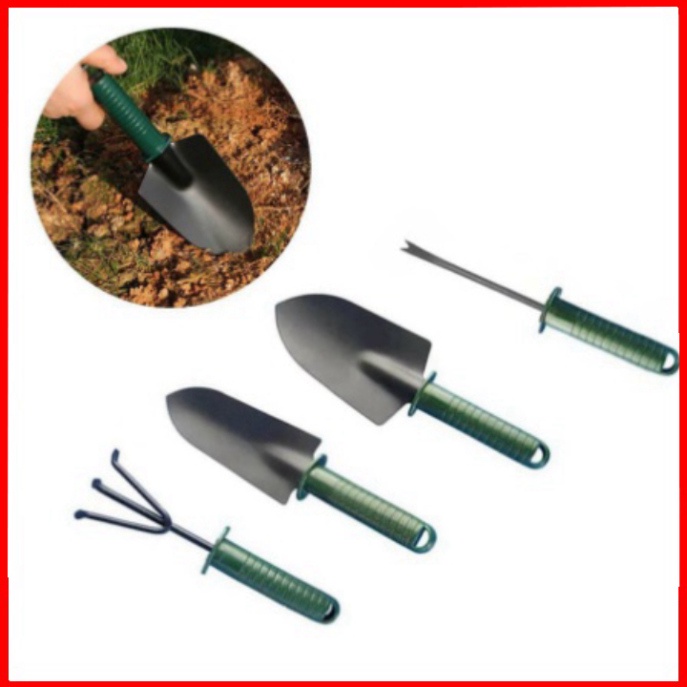 - Bộ dụng cụ làm vườn 3 món cán bọc Nhựa pp và gỗ phía dưới tay cầm, gồm xẻng, cào xới đất. Bộ dụng cụ phù hợp cho việc chăm sóc cây, trồng rau trồng hoa, làm cây cảnh.