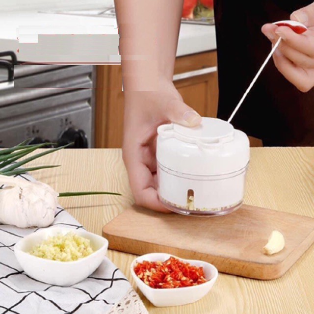 -Cực dễ dàng, chỉ cần cho đồ vào, đậy nắp, kéo & thả phần dây kéo liên tục, dây kéo sẽ làm quay lưỡi cắt bên trong, xay nhuyễn đồ ăn không hề vất vả. Dùng được mọi lúc mọi nơi, ko cần điện.