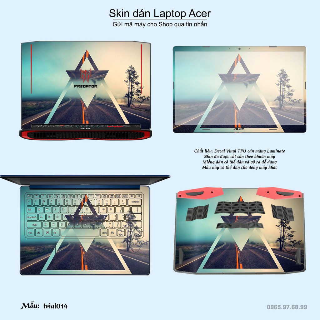 Skin dán là phương pháp tối ưu để làm đẹp và bảo vệ chiếc Laptop Acer của bạn,Miếng dán đã được cắt sẵn theo khuôn máy, cắt chính xác các chi tiết như camera, cảm biến, logo, bàn phím...
