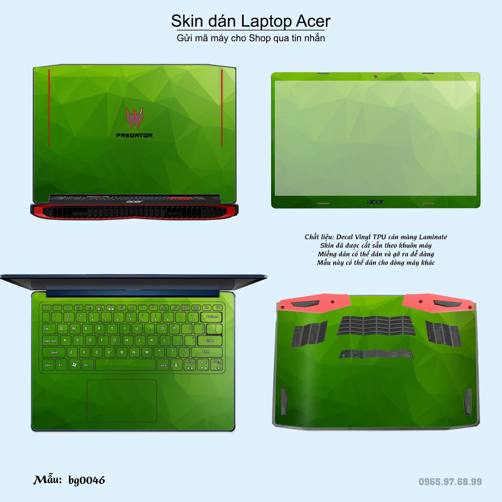 Skin dán là phương pháp tối ưu để làm đẹp và bảo vệ chiếc Laptop Acer của bạn,Miếng dán đã được cắt sẵn theo khuôn máy, cắt chính xác các chi tiết như camera, cảm biến, logo, bàn phím...