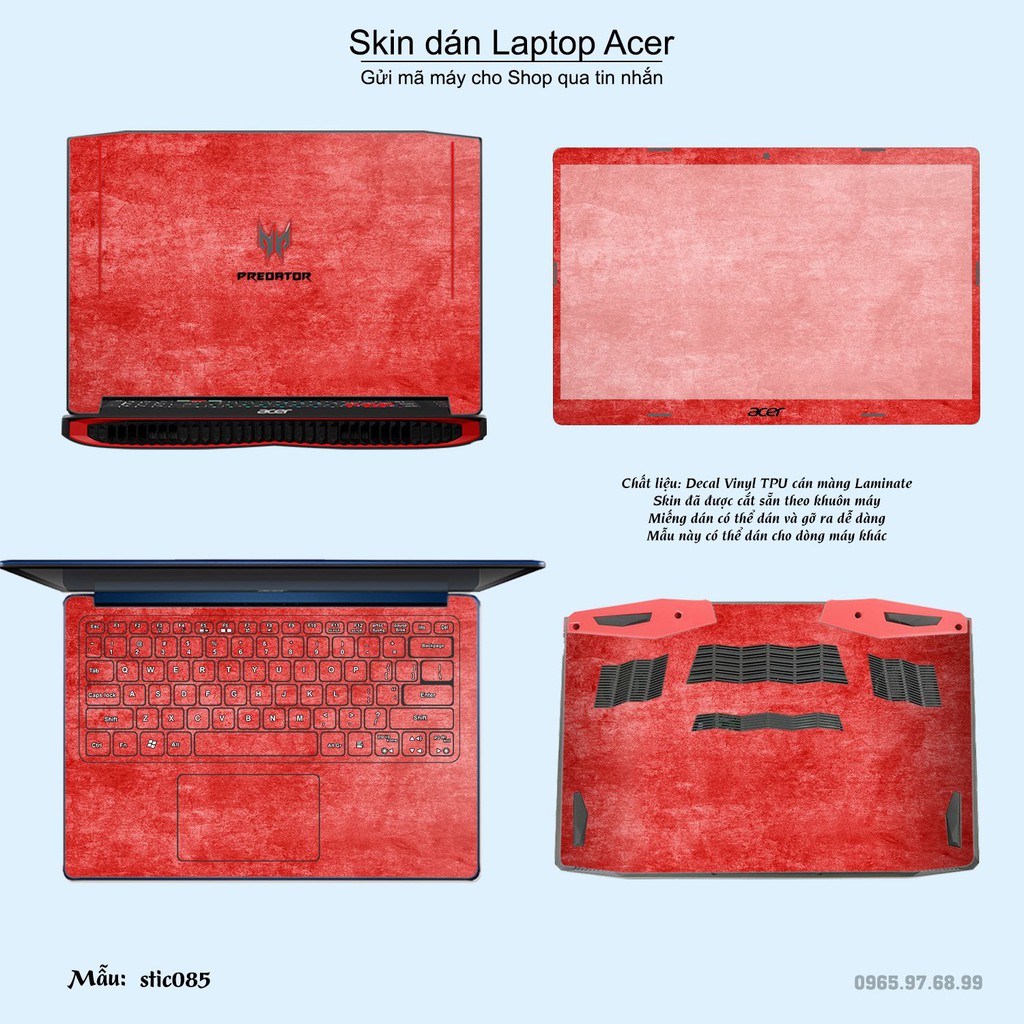 Skin dán là phương pháp tối ưu để làm đẹp và bảo vệ chiếc Laptop Acer của bạn,Miếng dán đã được cắt sẵn theo khuôn máy, cắt chính xác các chi tiết như camera, cảm biến, logo, bàn phím...