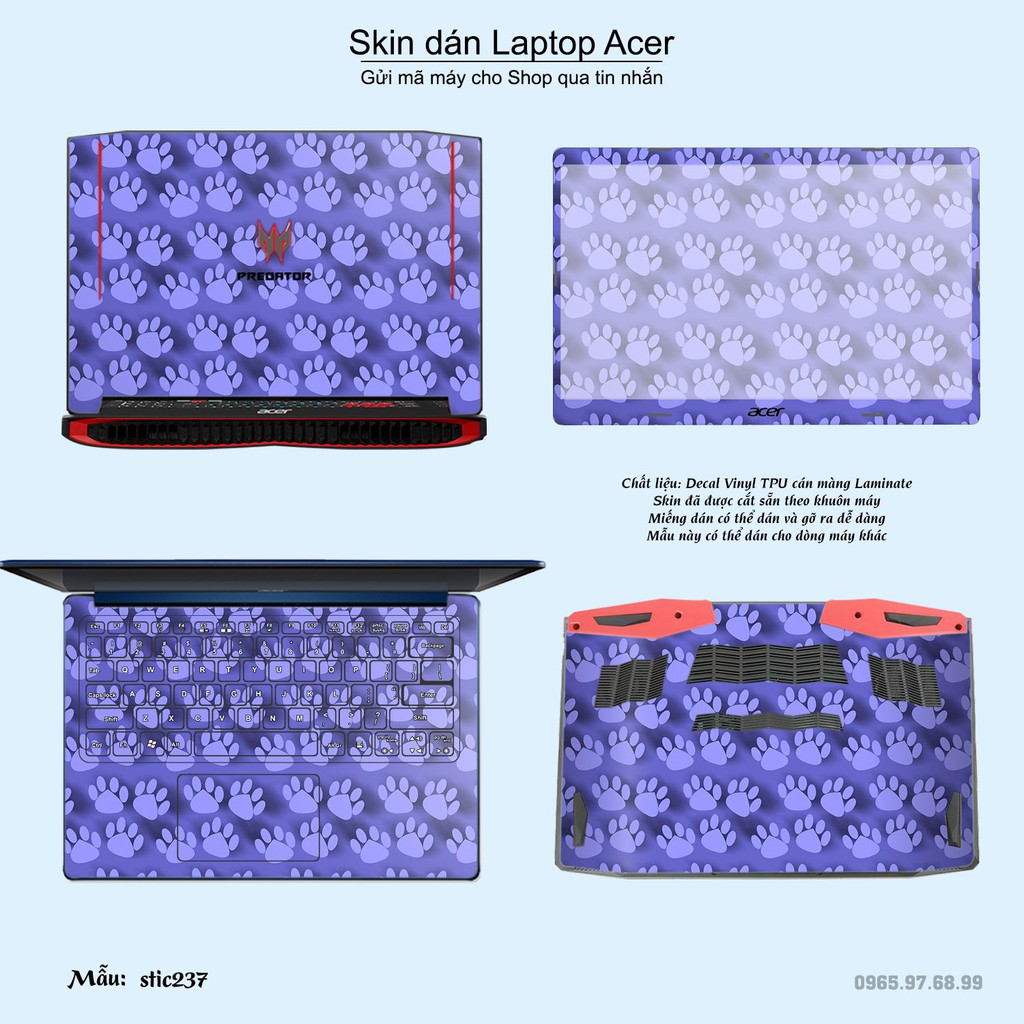 Skin dán là phương pháp tối ưu để làm đẹp và bảo vệ chiếc Laptop Acer của bạn,Miếng dán đã được cắt sẵn theo khuôn máy, cắt chính xác các chi tiết như camera, cảm biến, logo, bàn phím...