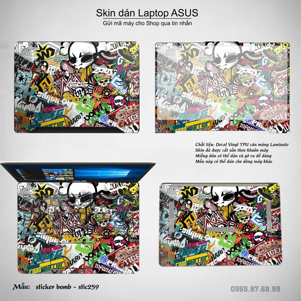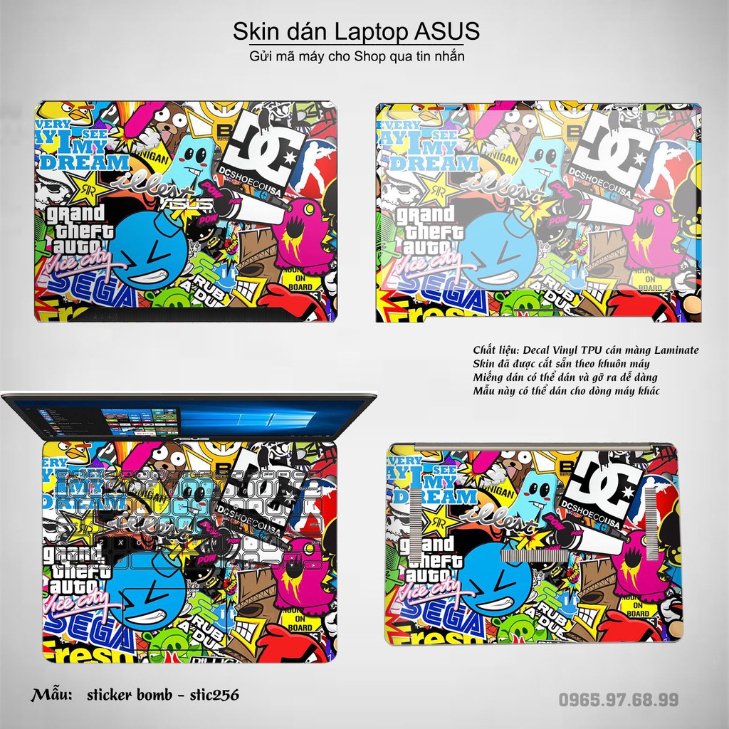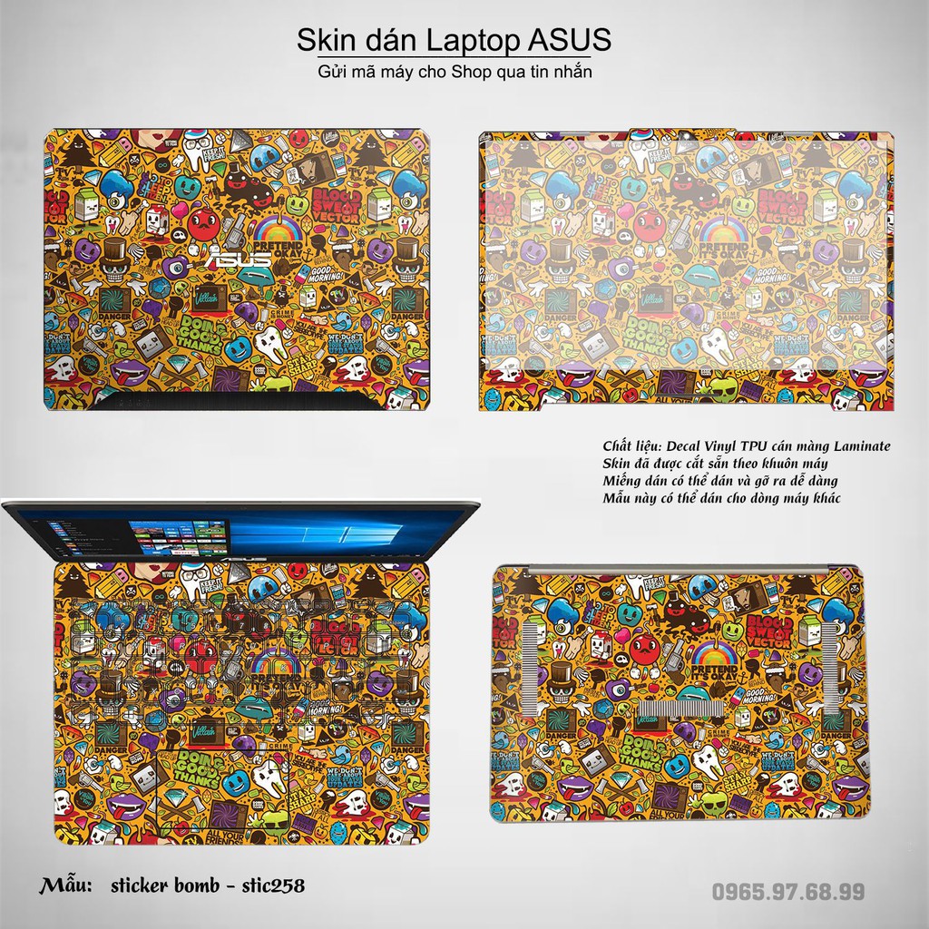 Skin dán Laptop Asus in hình sticker bomb (inbox mã máy cho Shop)