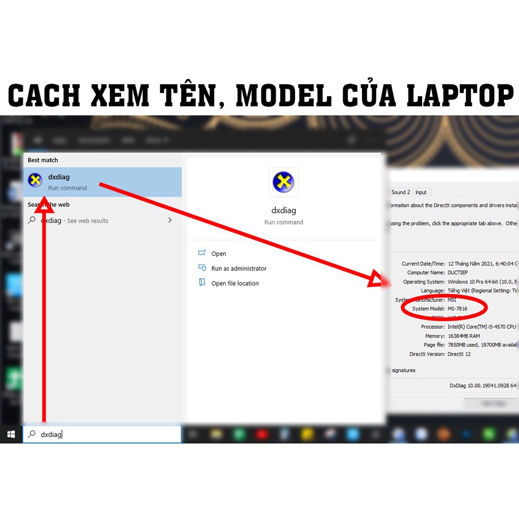 // Tên máy được ghi ở mặt đáy laptop hoặc bạn bấm tổ hợp phím Window+R để vào Run -> gõ: dxdiag là ra ạ.