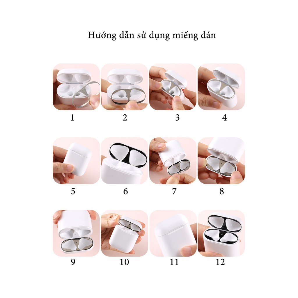 Bộ dán tai nghe Airpods gồm:+ Miếng dán kim loại tùy chọn màu sắc