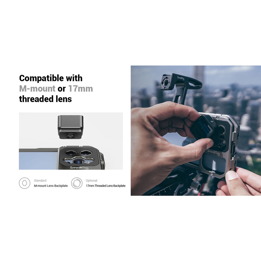 SmallRig Cage iPhone 13 Pro - Khung bảo vệ làm bằng kim loại hợp kim nhôm hỗ trợ quay tối ưu cho Iphone 13 Pro. Khung thiết kế đẹp, trang bị lớp silicon bên trong khung bảo vệ máy tránh va đập, rơi ảnh hưởng đến máy.Ngoài ra khung hỗ trợ M-Mount lens cho dòng lens cho điện thoại - tương tự 17mm chuẩn chung như 1 số dòng lens anamorphic, lens wide của Ulanzi, Moment ...
