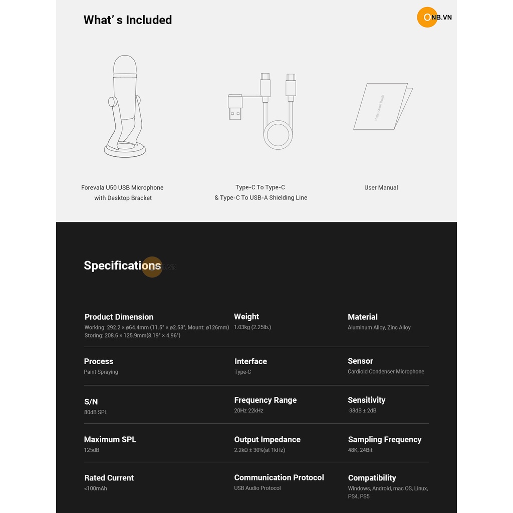 Forevala U50 USB Microphone 3465 hỗ trợ rất nhiều thiết bị Windows, Linux, PS4, PS5, Android, macOS .... cắm là sử dụng không cần pin hay nguồn phụ.