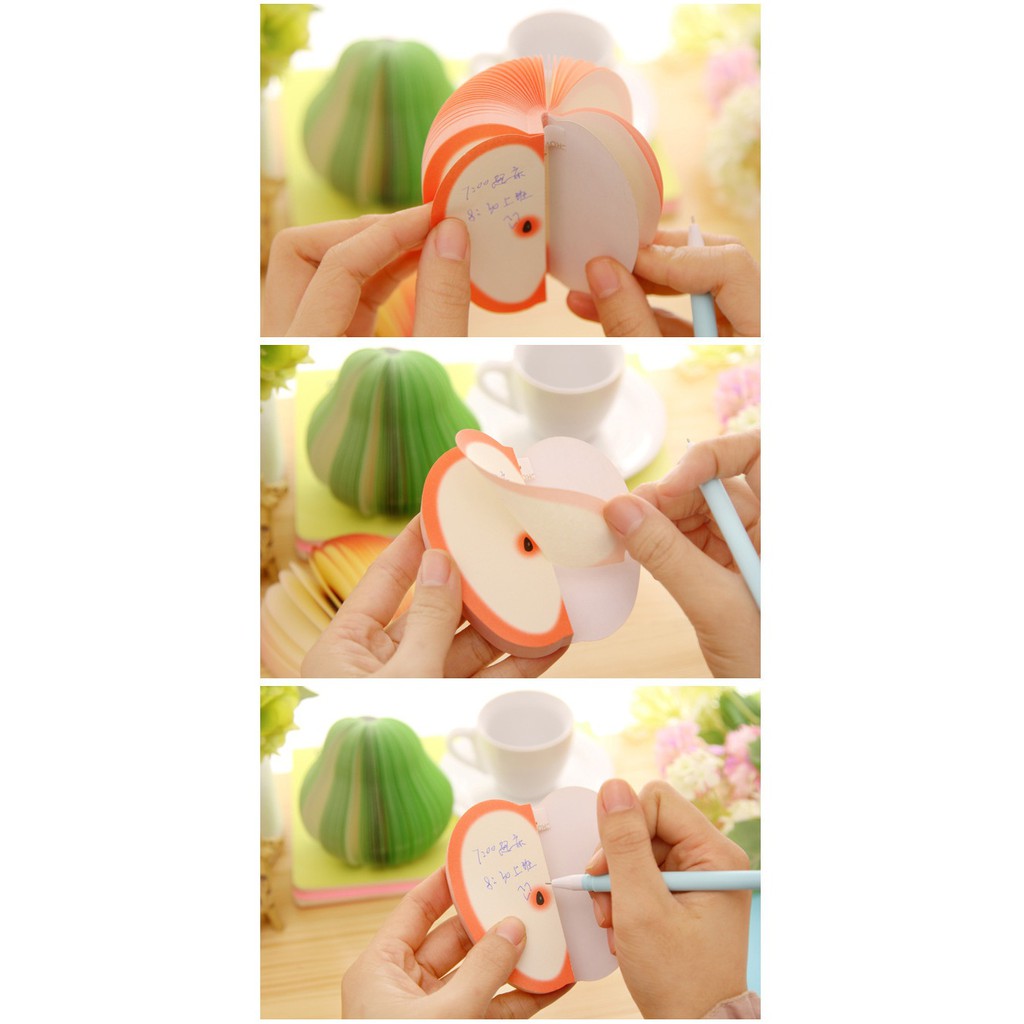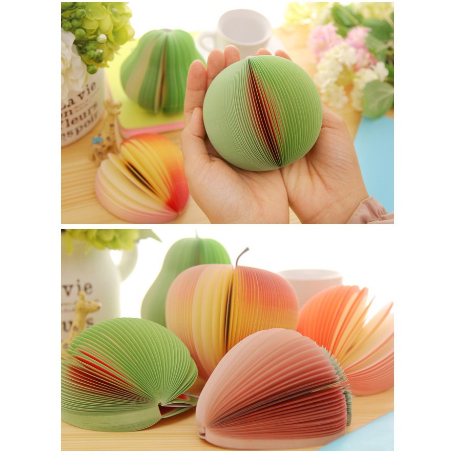 Thật độc đáo và sáng tạo khi bạn bung những cuộn giấy ghi chú ra những hình dạng trái lê,trái táo,dưa hấu,cam ... được phô bày một nét tinh tế và đầy nghệ thuật sáng tạo của trí óc.Sản phẩm thật tiện dụng bạn có thể dùng làm sổ ghi chú hoặc trang trí cho góc làm việc của mình đấy