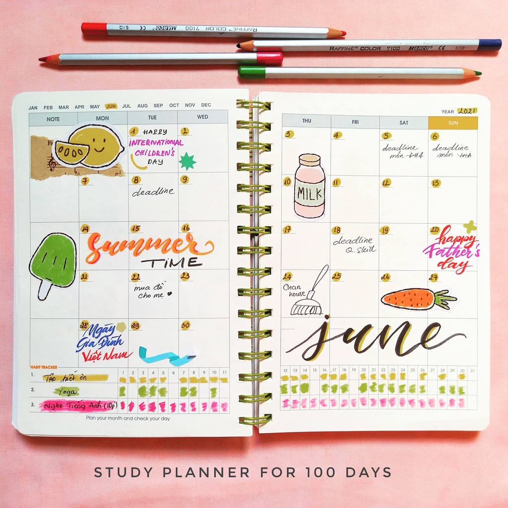📔100 trang Daily Plan với bố cục cực chi tiết bao gồm: Date (Ngày), D – day (Ngày hoàn thành), Goal (Mục tiêu), Total time (Tổng thời gian học) cùng bảng check nội dung học tập và thời gian học cho từng môn. Tips cho bạn đó là sử dụng mỗi màu mực cho từng môn học và đánh dấu đúng màu đó vào bảng thời gian học để tiện theo dõi.