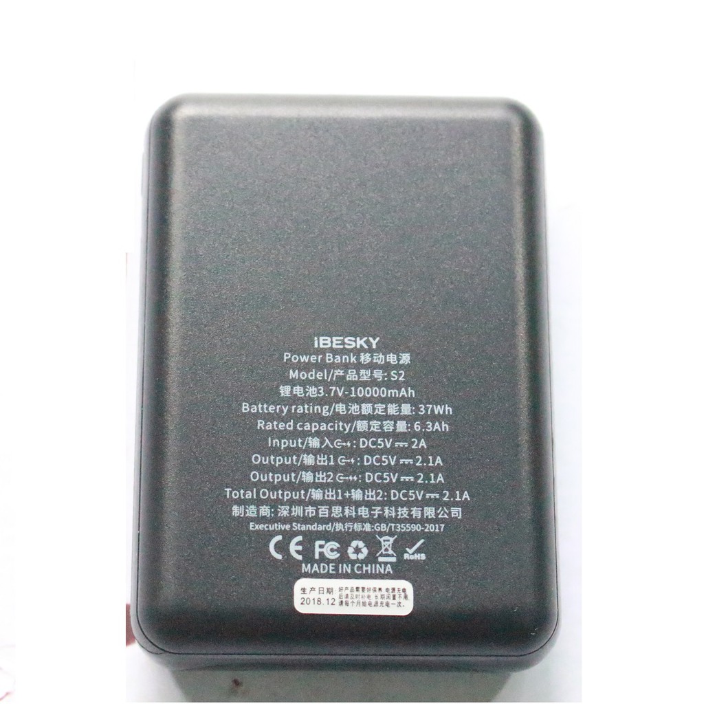 Pin sạc dự phòng iBESKY S2 10000mAh LCD - thiết kế nhỏ gọn, 2 cổng sạc, có đèn pin (2 màu) - Hãng phân phối chính thức- Dung lượng pin IBESKY S2 là10.000mAh nhưng pin được thiết kế vuông vức nằm gọn trong lòng bàn tay