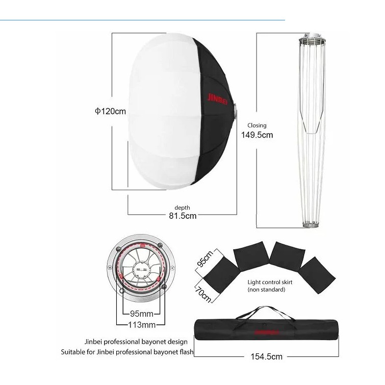 Softbox cầu Chinaball Jinbei 120cm là sản phẩm mới 2021 của hãng giúp chiếu sáng toàn bộ không gian bằng ánh sáng mềm dịu với một tia nguồn sáng. Chinaball Jinbei bằng cách sử dụng thiết kế hình cầu, đèn lồng lan tỏa ánh sáng từ đèn LED hoặc đèn flash của bạn theo mọi hướng. Đi kèm softbox cầu 120cm là những tấm chắn sáng cho phép bạn kiểm soát ánh sáng chính xác hơn với 4 phần hoàn toàn có thể điều chỉnh, cung cấp giải pháp ánh sáng dịu cấp điện ảnh. Chinaball 120cm Jinbei với thiết kế nhả nhanh dựa trên lực căng nên lắp đặt và tháo ra chỉ trong vòng vài giây, sản phẩm đang được bán tại thietbiquayphim với giá tốt nhất.THÔNG SỐ KỸ THUẬT: