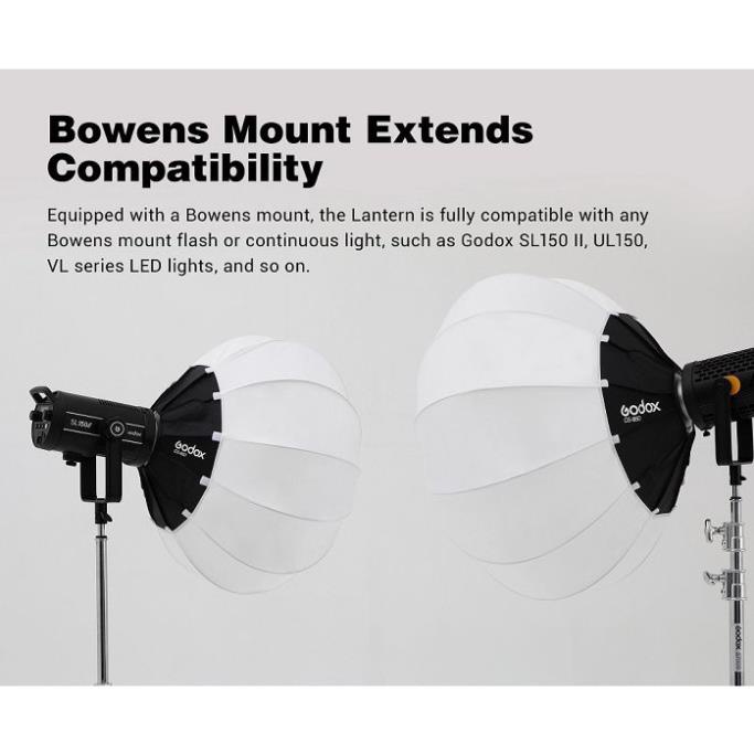 Softbox cầu Godox 85cm CS-85D thiết kế theo kiếu thao tác nhanh, có thể gấp gọn để mang theo tác nghiệp. Softbox CS-85D được làm bằng hợp kim nhôm, khung gắn được làm bằng thép không gỉ. Softbox có dạng hình cầu cho ánh sáng chiếu xung quanh hướng 360°, ngoài ra có thêm một lớp vải trắng bọc xung quanh để làm giảm lượng ánh sáng ra và làm cho toàn bộ ánh sáng đều và tự nhiên, giúp phân tán ánh sáng tốt hơn. CS-85D có giá treo Bowens phù hợp với đèn Godox như dòng SL150 II, UL150 và VL, nhưng nó cũng tương thích với nhiều đèn khác sử dụng giá đỡ phổ biến này.THÔNG SỐ KỸ THUẬT SOFTBOX CS-85D