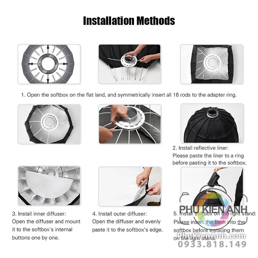 Mở softbox trên mặt đất bằng phẳng, và chèn tất cả 16 thanh sao cho đối xứng vào vòng chuyển adapter.