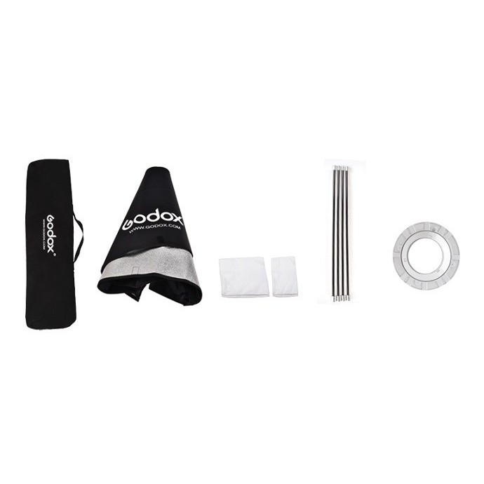 Bao gồm: Bộ softbox 2 lớp Godox 35*160cm, adapter silver aluminium cho bowen mount, túi đựng kèm theo.