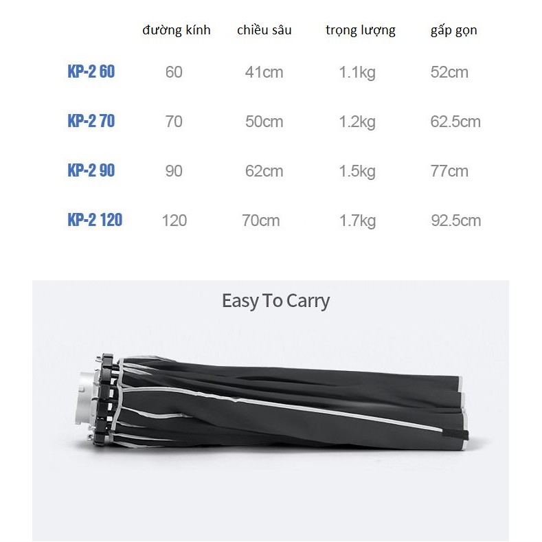 Softbox Parabolic thao tác nhanh Triopo KP2-120 ngàm Bowen là bản nâng cấp mới nhằm tháo lắp và lưu trữ dễ dàng và thuận tiện hơn. Triopo KP2-120 thiết kế 16 cạnh, miệng sâu hình parabol giúp cho ánh sánh đồng đều hơn. Với thiết kế hình parabol sâu, khoảng cách truyền ánh sáng xa, tăng cường độ chiếu sáng với mức độ phong phú hơn và lượng ánh sáng dịu hơn nhờ tấm tản sáng đi kèm với softbox.THÔNG SỐ KỸ THUẬT: