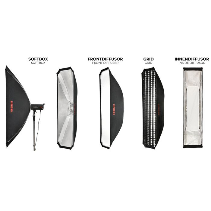 Sản phẩm bao gồm: 1 x Jinbei KE 35×140, 1 x bộ khuếch tán bên trong, 1 x bộ khuếch tán phía trước màu trắng, 1 x lưới tổ ong, 1 x túi.