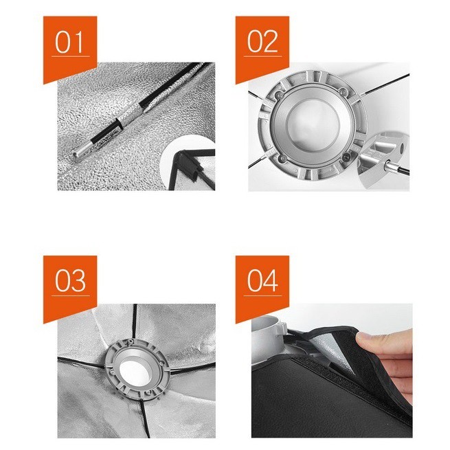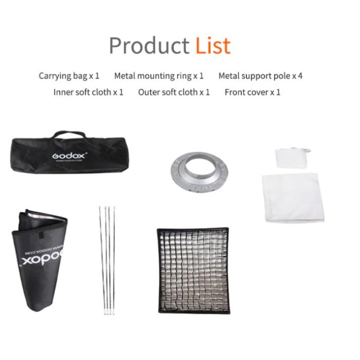Bao gồm: Bộ softbox 2 lớp tổ ong Godox 80x120cm, adapter silver aluminium cho bowen mount, túi đựng kèm theo.