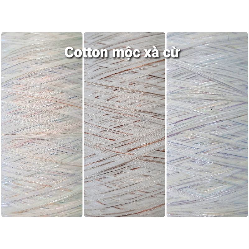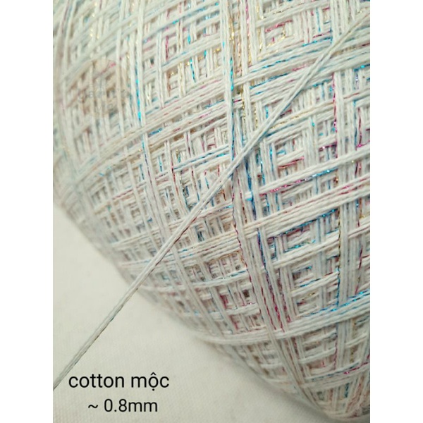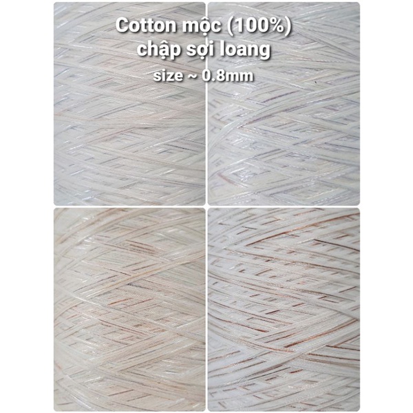 Sợi cotton 100% màu trắng mộc chập 1 sợi xà cừ hoặc poly loang, tạo điểm nhấn cho sản phẩm. Sợi chắc, mềm, nhẹ. Đây là loại sợi màu tự nhiên, không hóa chất, thân thiện với môi trường. Sợi không bay nhão, chất cotton thấm hút tốt, sản phẩm dùng nhiều càng mềm bóng.Cỡ sợi nhỏ tiện dụng, chập từ 2 đến 6 sợi (tùy màu), tầm 0.6 ~ 0.7mm. Bạn có thể chập 2 hoặc 3 để đan móc. Thích hợp để làm áo váy, doily, lace...
