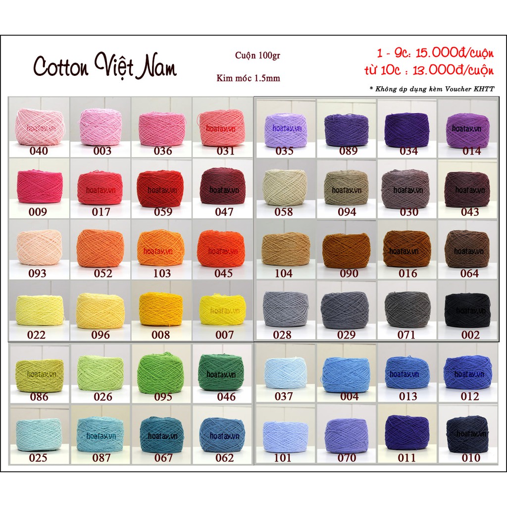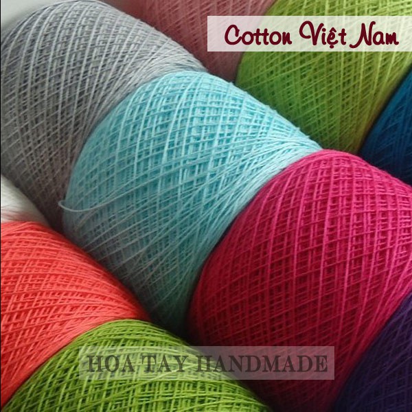 Sợi Cotton Việt Nam : Dùng móc các sản phẩm trang trí, khăn trải bàn, lót ly, amigurumi (móc chìa khoá), túi xách, túi điện thoại....Ưu điểm: sợi chắc, bền. Màu sắc đa dạng.