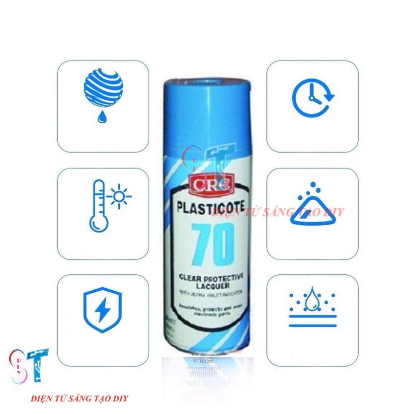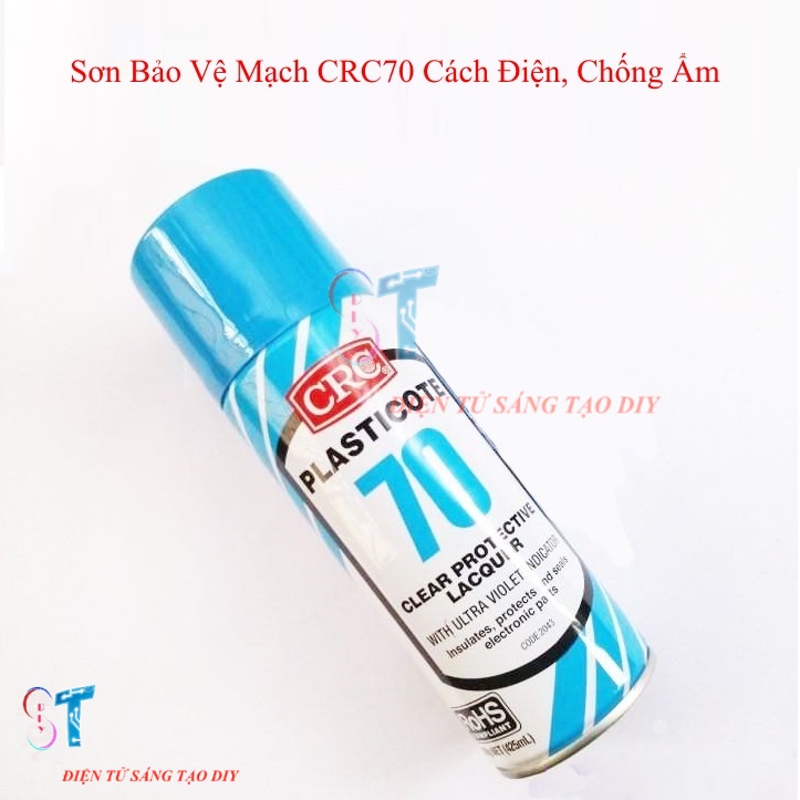 Tính năng sản phẩm:- Sơn bảo vệ mạch CRC70 cách điện, chống ẩm dùng để phủ lên bề mặt mạch in, tạo 1 lớp bóng bảo vệ mạch, chống oxi hóa sử dụng trong môi trường ẩm ướt.