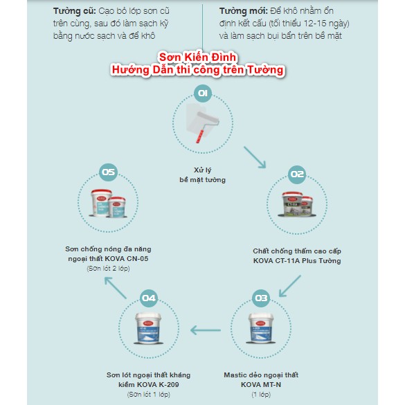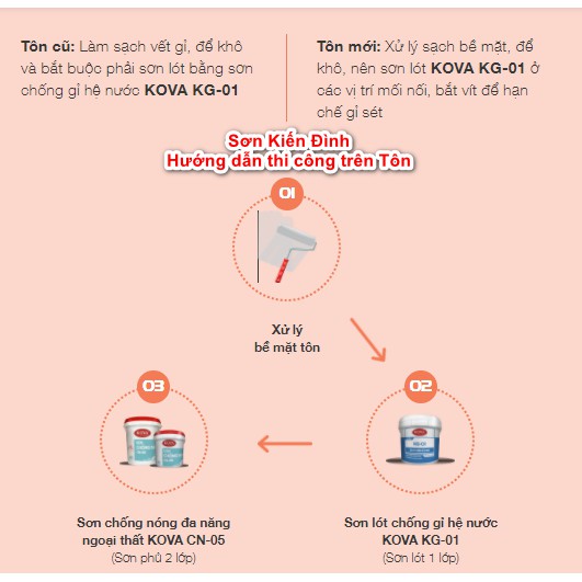 -Tôn mới: Xử lý sạch bề mặt, để khô, nên sơn lót KOVA KG-01 ở các vị trí mối nối, bắt vít để hạn chế gỉ sét