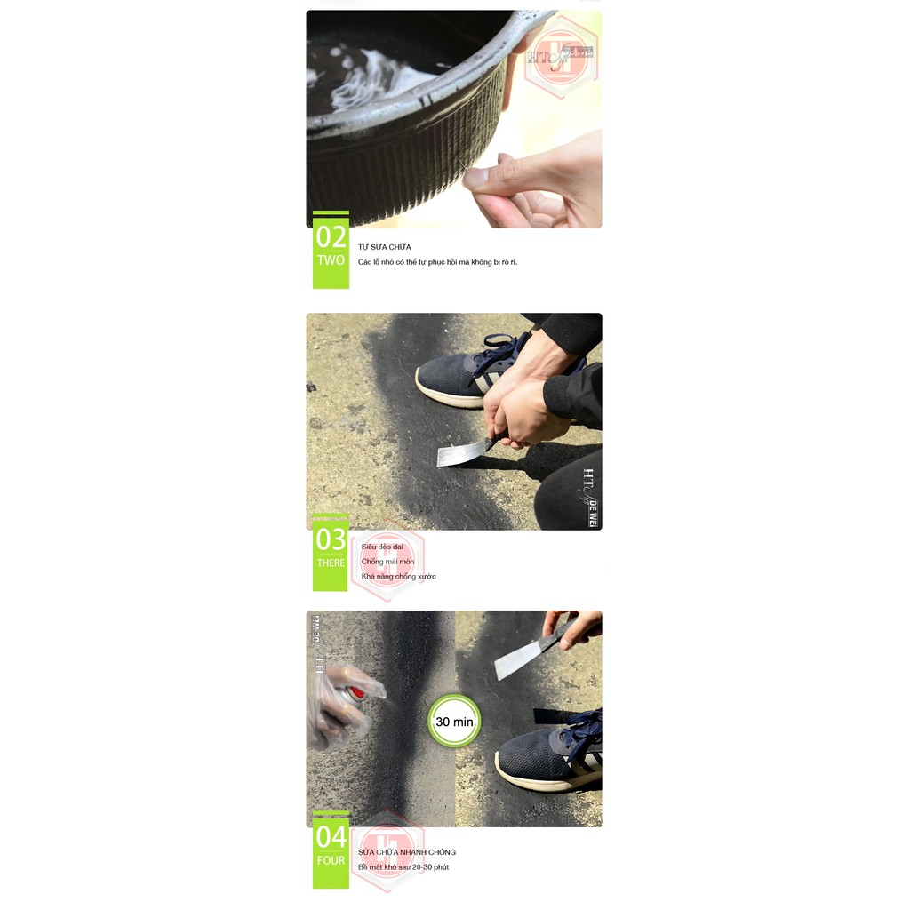 Ứng dụng: Phủ lên vết nứt tường nhà, đường ống dẫn nước, các hạng mục có khe hở nhỏ như lỗ đinh trên mái tôn... vết nứt trên thùng nhựa hoặc ca nước..