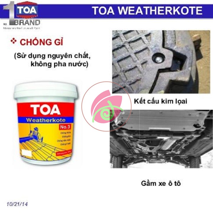 Chất chống thấm Toa Weatherkote hay Toa Weatherkote No.3 thích hợp chống thấm cho mái nhà, máng nước, bếp, khu vực vệ sinh và các kết cấu bê tông khác, chống thấm cho các loại tài thuyền. Chống ẩm cho tường và sàn tầng trệt
