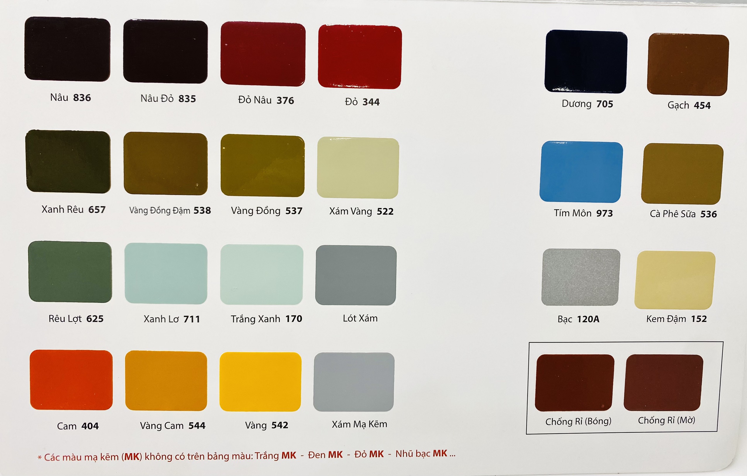 Mã màu Sơn Bạch Tuyết: màu Yamaha Đậm 736, màu Yamaha 715, màu Yamaha Lợt 714, Hoà Bình 713, Hoà Bình Lợt 712, Vert Đậm 624D, Vert Nikko 675N, Vert 618, Vert Lợt 615, Lá Mạ 653, Vàng Lợt 513, Vàng Chanh 562, Kem 512, Kem Lợt 511, Vàng Kem 151, Xám Đậm 123, Xám 122, Xám Lợt 121, Trắng Xám 160, Xám Xanh 172, Ngói 452, Hồng Đất 144, Hồng Phấn 133, Hồng 132, Xanh Ngọc Đậm 674, Cẩm Thạch Lợt 623, Xanh Ngọc 612D, Cẩm Thạch 612, Nâu 836, Nâu Đỏ 835, Đỏ Nâu 376, Đỏ 344, Xanh Rêu 657, Vàng Đồng Đậm 538, Vàng Đồng 537, Xám Vàng 522, Rêu Lợt 625, Xanh Lơ 711, Trắng Xanh 170, Cam 404, Vàng Cam 544, Vàng 542, Dương 705, Tím Môn 973, Nhũ Bạc 120A, Gạch 454, Cà Phê Sữa 536, Kem Đậm 152, Sơn Chống Rỉ Bóng – Mờ - Xám.