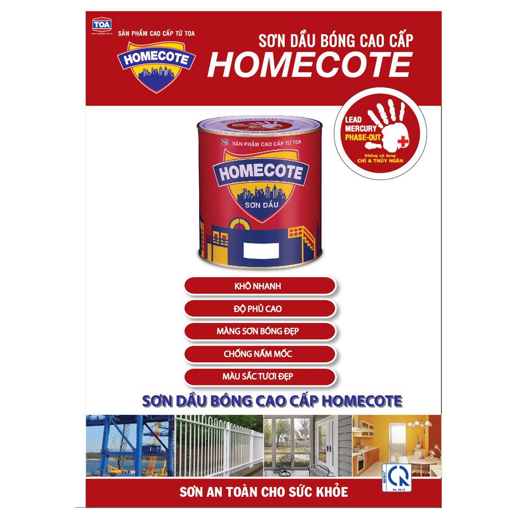 Sơn dầu bóng cao cấp Homecote là loại sơn Alkyd chất lượng cao, không sử dụng Chì & Thuỷ Ngân, là loại sơn an toàn cho sức khoẻ với các tính năng: Khô nhanh, màng sơn bóng đẹp, độ phủ cao, chống nấm mốc, màu sắc tươi đẹp.MỤC ĐÍCH SỬ DỤNG: