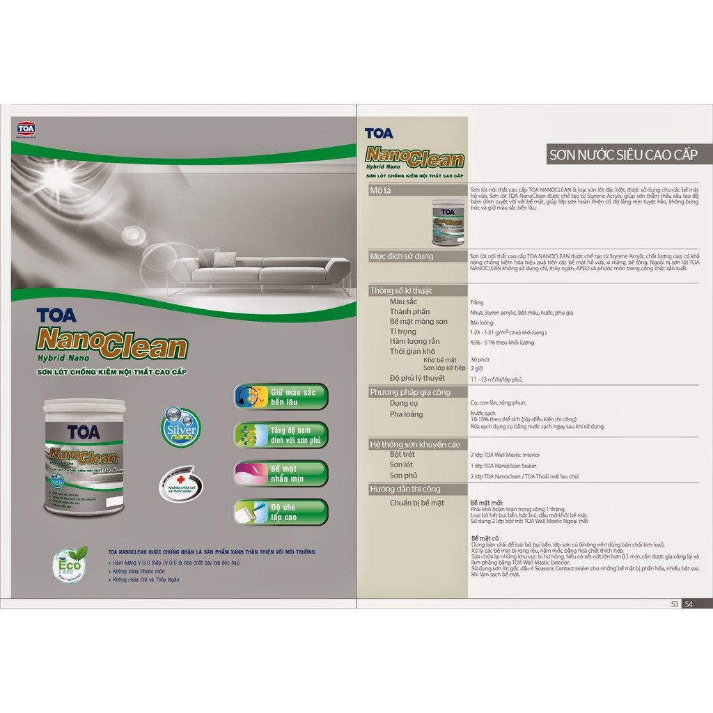Sơn lót chống kiềm cao cấp Toa Nanoclean nội thấtSơn lót chống kiềm nội thất cao cấp TOA NanoClean là loại sơn lót đặc biệt, được sản xuất từ nhựa Styrene Acrylic, không chứa chì, thủy ngân trong công thức với những tính năng: độ bám dính tuyệt vời, không bong tróc, chống kiềm hóa, tạo độ láng mịn và giữ màu sắc bền lâu cho lớp sơn phủ