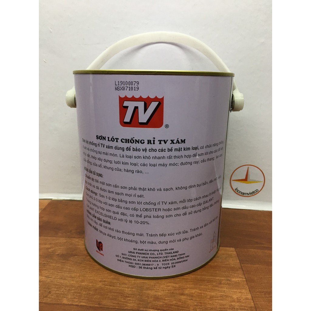 Sơn Lót chống rỉ TV màu xám dùng để bảo vệ cho các bề mặt kim loại có chức năng chống rỉ sét và chố sự mài mòn. là sơn nhanh khô, rất thích hợp để sơn lót cho các đồ vật như: sắt, thép xây dựng, lưới kim loại máy móc, đường ray, cầu thang, lan can, cửa cổng, cửa sổ, khung cửa hàng rào,...Đóng gói: 0.375l; 0,875l, 3l, 17,5L