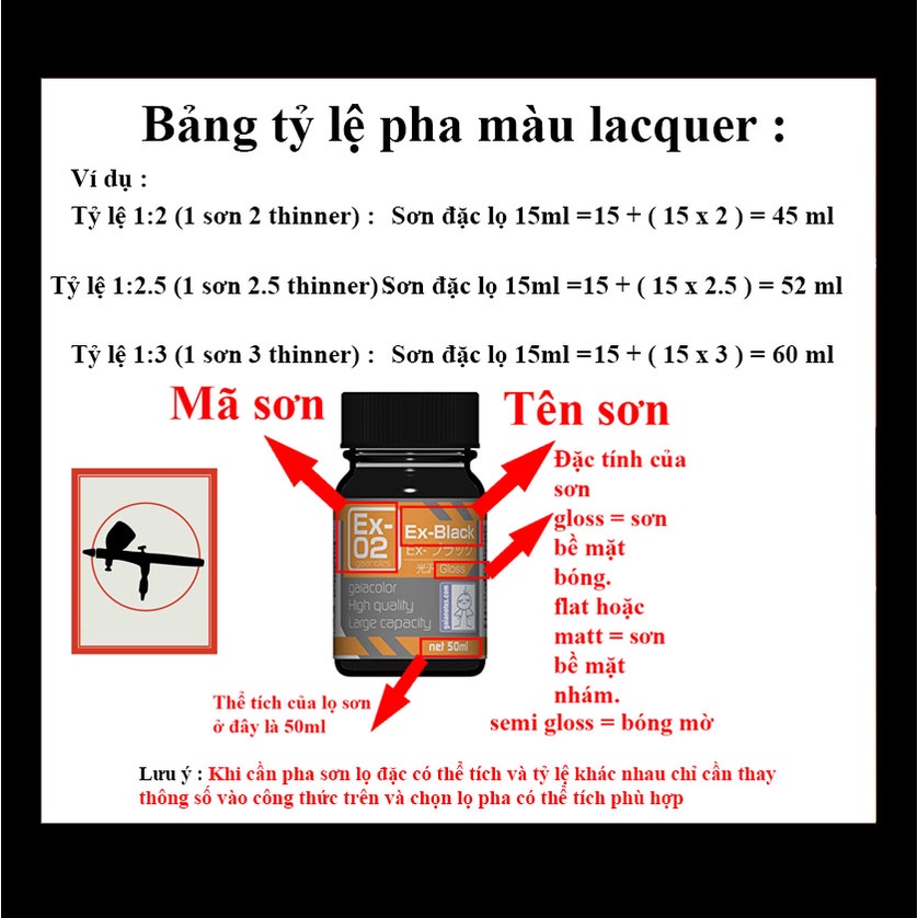 Tỷ lệ pha 1:2(1 phần sơn 2 phần thinner hoặc 2.5 thinner tùy theo sở thích) có thể dùng thinner các hãng như gaia, mr hobby, jumpwind, sunin7.