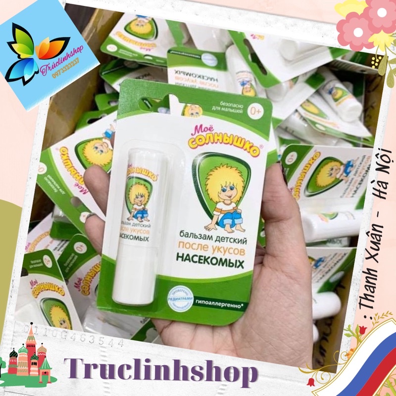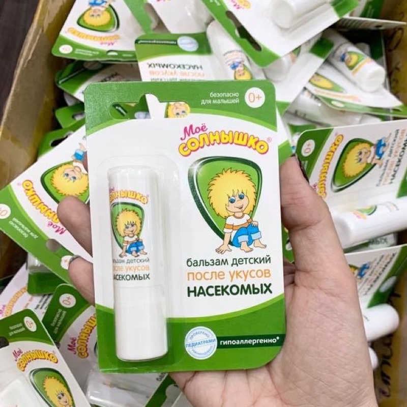 <3 <3 <3 Dùng được cho trẻ sơ sinh 0+lKem bôi da dạng son cho trẻ em sau khi bị côn trùng cắn.Được thiết kế dạng thỏi như son môi phụ nữ, bạn chỉ cần chấm vào vết muỗi và côn trùng đốt rồi di chuyển nhẹ như đánh son, 1 lúc sau vết cắn được :3 giảm ngứa, :3 lặn và :, :3 để lại vết thâm. Sản phẩm được bán trong các hiệu thuốc của Nga. Dùng tốt, đảm bảo sức khỏe cho con của bạn, kể cả làn da nhạy cảm nhất.