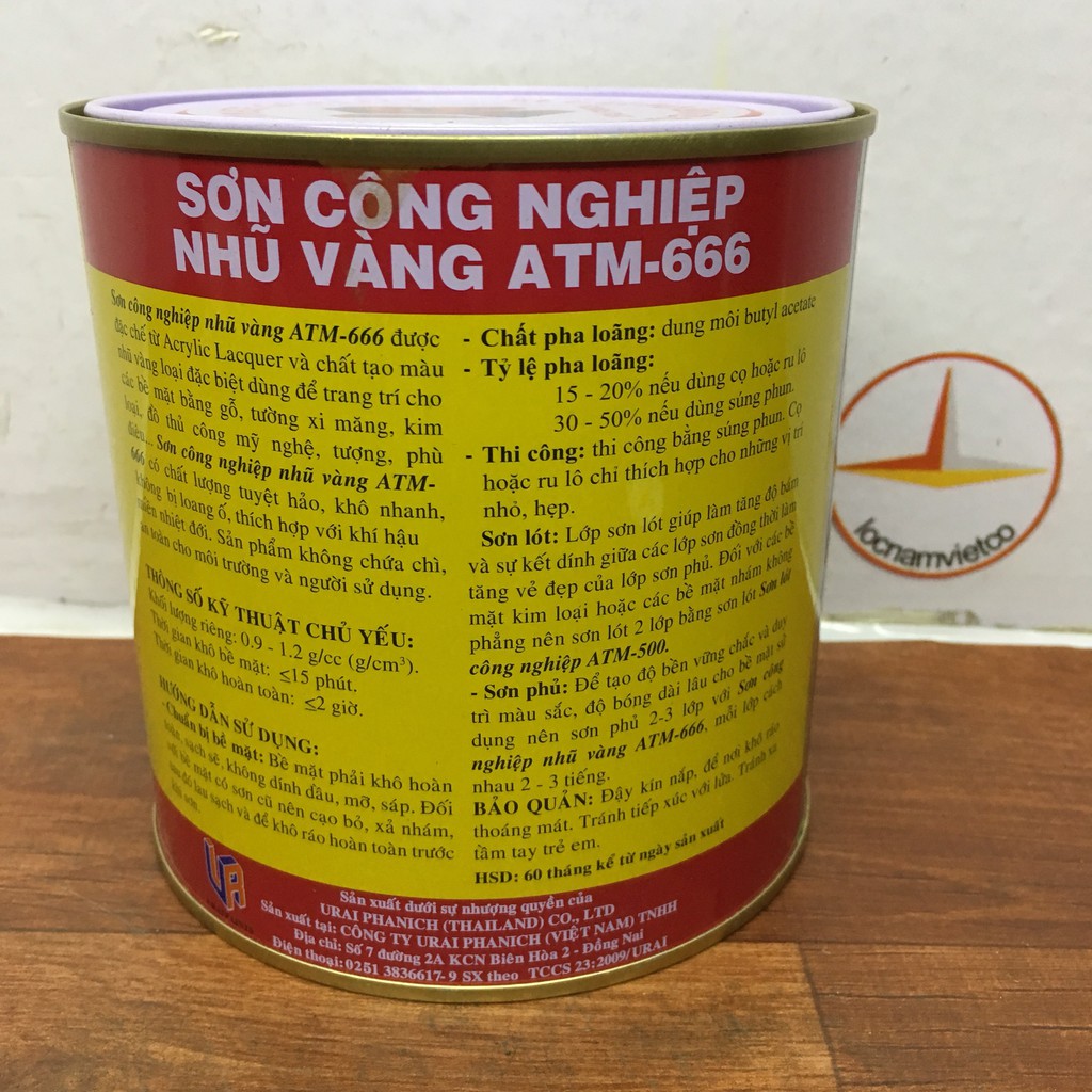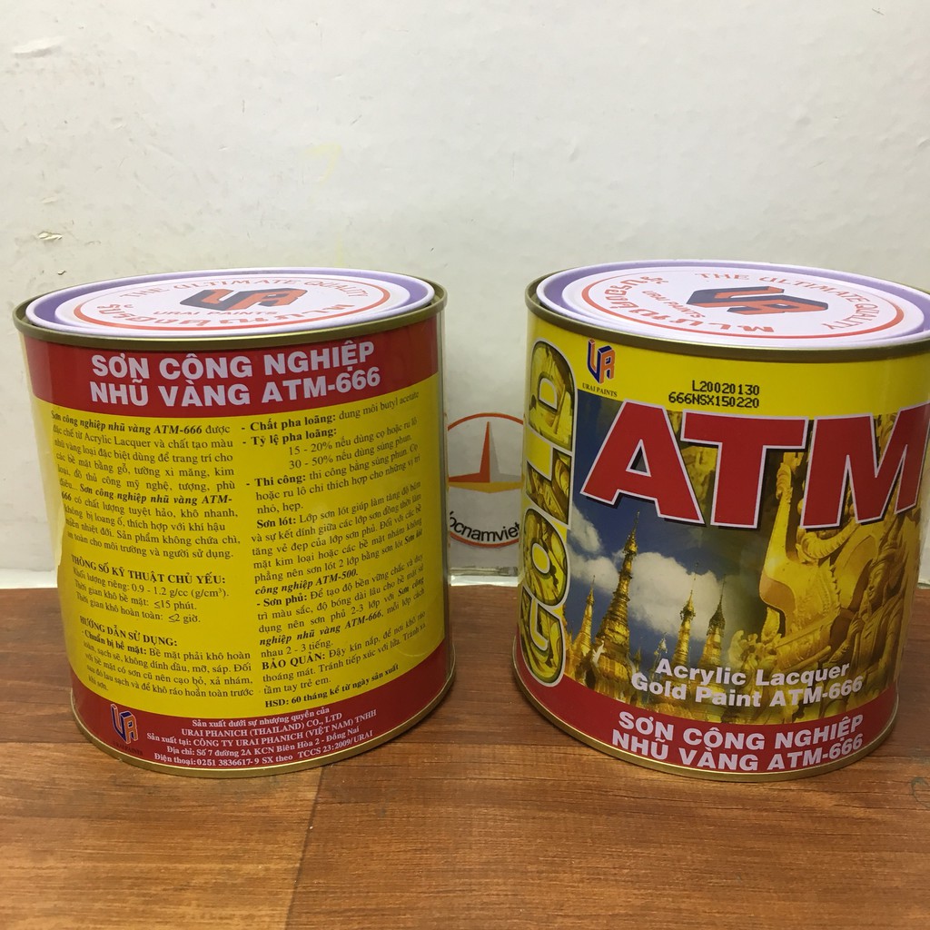 Sơn nhũ vàng ATM 666 dùng cho sắt và gỗ: Sơn công nghiệp nhũ vàng " ATM - 666 " được đặc chế từ Acrylic Lacquer kết hợp với chất tạo màu nhũ vàng lọai đặc biệt dùng để trang trí cho các bề mặt bằng gỗ, kim lọai, đồ thủ công mỹ nghệ , tượng phù điêu và đặc biệt những nơi trang nghiêm như cửa , cổng đền , chùa , cho sắc màu uy nghi , rực rỡ , sáng óng ánh .Đóng Gói: 0,8L