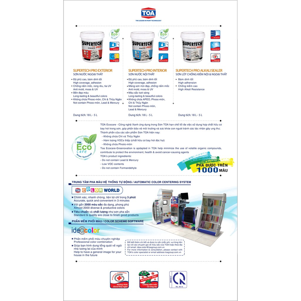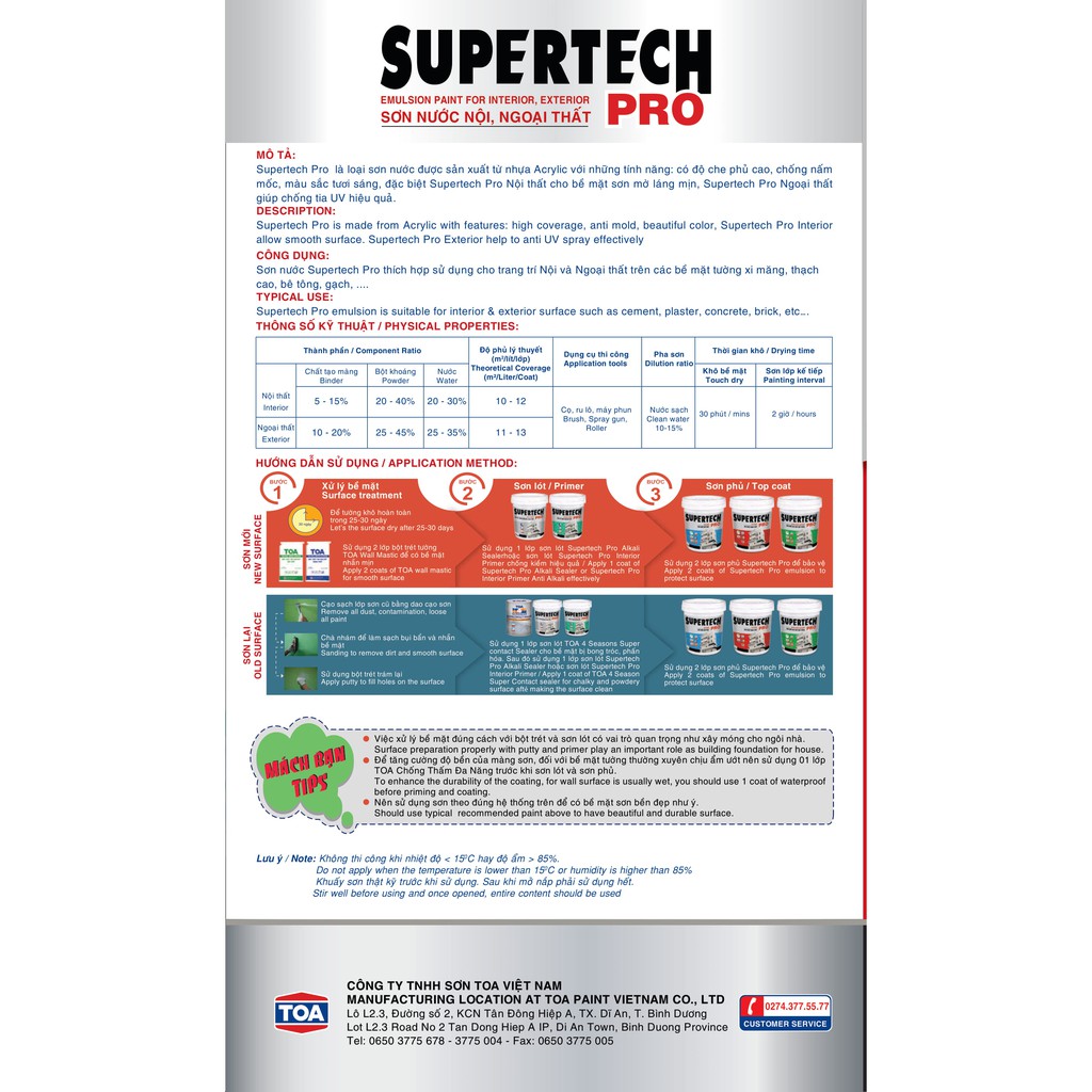 Sơn nước ngoại thất Supertech Pro được sản xuất từ nhựa Acrylic, dùng để bảo vệ bề mặt tường ngoài trời. Bề mặt màng sơn mờ, láng mịn, có thể chịu đựng thời tiết khắc nghiệt, chống phai màu, phấn hoá. Với ứng dụng kỹ thuật mới, sản phẩm có chất lượng tốt, độ che phủ cao, chống kiềm hoá, chống rong rêu, nấm mốc và tia UV. Sản phẩm không chứa formaldehyde, Chì và Thuỷ ngânCông nghệ TOA Eco Care được TOA đưa vào các sản phẩm sơn để tạo ra những vật liệu xây dựng thích nghi với môi trường