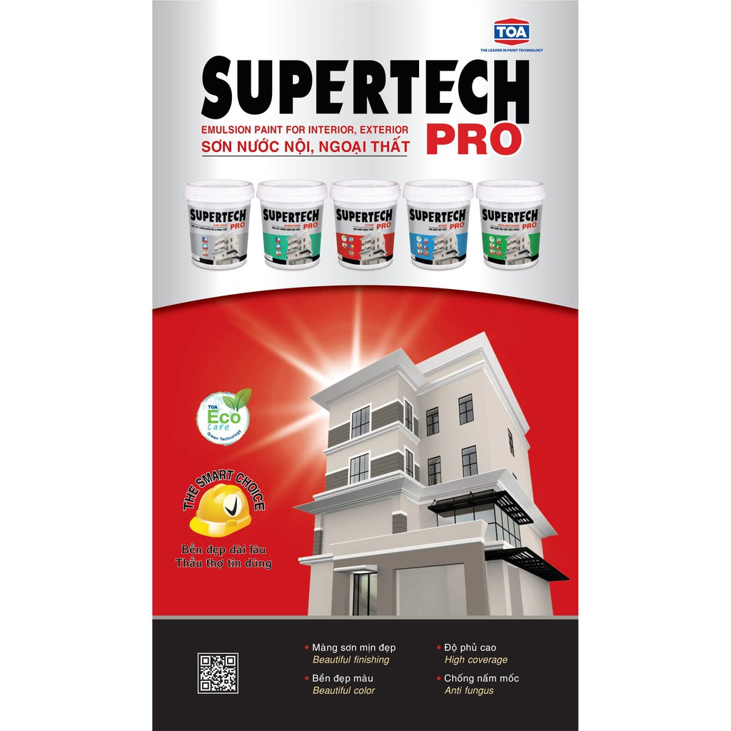Sơn nước ngoại thất Supertech Pro được sản xuất từ nhựa Acrylic, dùng để bảo vệ bề mặt tường ngoài trời. Bề mặt màng sơn mờ, láng mịn, có thể chịu đựng thời tiết khắc nghiệt, chống phai màu, phấn hoá. Với ứng dụng kỹ thuật mới, sản phẩm có chất lượng tốt, độ che phủ cao, chống kiềm hoá, chống rong rêu, nấm mốc và tia UV. Sản phẩm không chứa formaldehyde, Chì và Thuỷ ngânCông nghệ TOA Eco Care được TOA đưa vào các sản phẩm sơn để tạo ra những vật liệu xây dựng thích nghi với môi trường